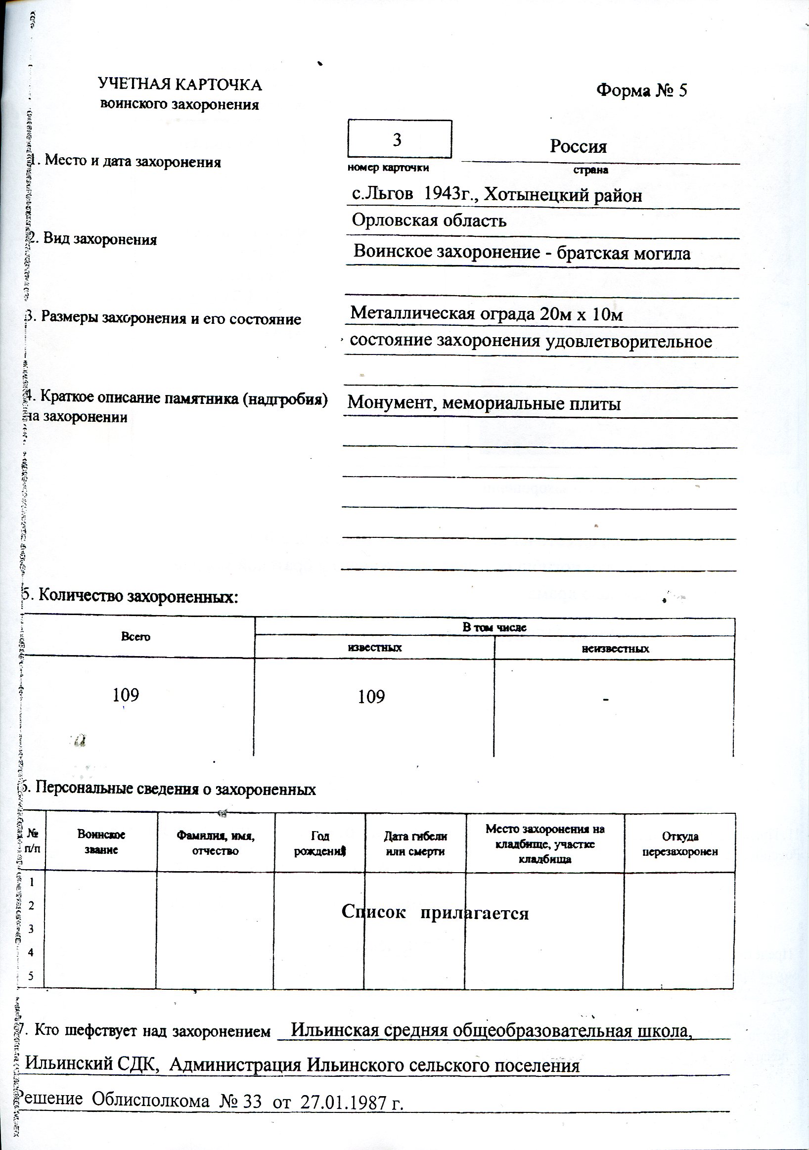 с.Ильинское – братская могила № 1 - 283 воина, погибшие за с.Ильинское, д.Волосатово; братская могила № 2- 40 воинов, погибших за д.Верховье, с.Льгов- 120 воинов, погибших за с.Льгов, д.Булатово, д.Радовище- 80 воинов, погибших за д.Радовище, с.Старое.