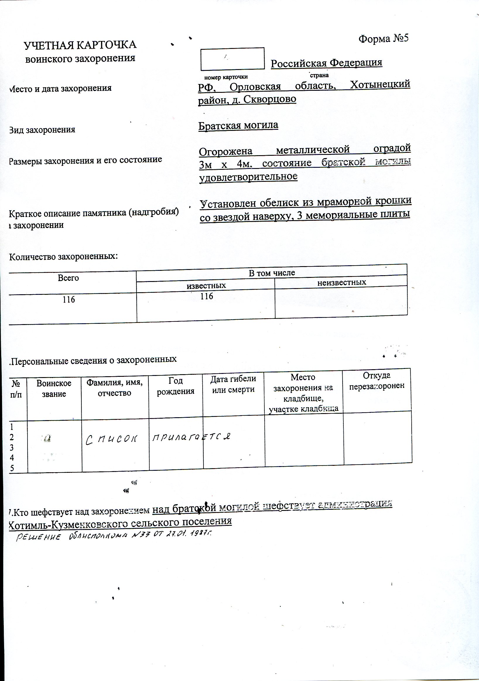 На территории Хотимль-Кузменковского сельского поселения в братских могилах в д. Скворцово и пос. Жудро покоятся останки более 400 советских воинов. Тяжелые бои на территории района проходили в июле-августе 1943 г.С 17 июля по 10 августа на территории нынешнего Орловского Полесья проходила наступательная операция "Кутузов", в которой участвовало 16 армий – 10 пехотных, 3 воздушных и 3 танковых. Войска левого крыла Западного фронта получили задачу прорвать немецкую оборону на северном фасе орловского выступа, юго-западнее Козельска. После прорыва обороны противника ударная группировка Западного фронта разделялась для наступления на двух расходящихся направлениях. Первая группа должна была принять участие в разгроме Болховской группировки противника, вторая – наступать в общем направлении на Хотынец, где был узел шоссейных дорог и станция железной дороги Орёл – Брянск. В результате советские войска должны были перехватить основную линию снабжения вермахта в районе Орла. В смертельной схватке сошлись более 500 тысяч солдат, 1000 самолетов и 3000 танков. 11-я стрелковая дивизия стремилась по кратчайшему пути выйти к железной дороге Хотынец – Карачев. С правого фланга сюда, в район Ильинского, перебрасывается 16-я гвардейская стрелковая дивизия. Она начала наступление в направлении Хотимль, Жудре, Умрихино, Строево, Скворцовский. Из архивных данных : «16 ГД была переброшена в район южнее Тросны для развития успеха 11 ГСД в направлении Хотынца».