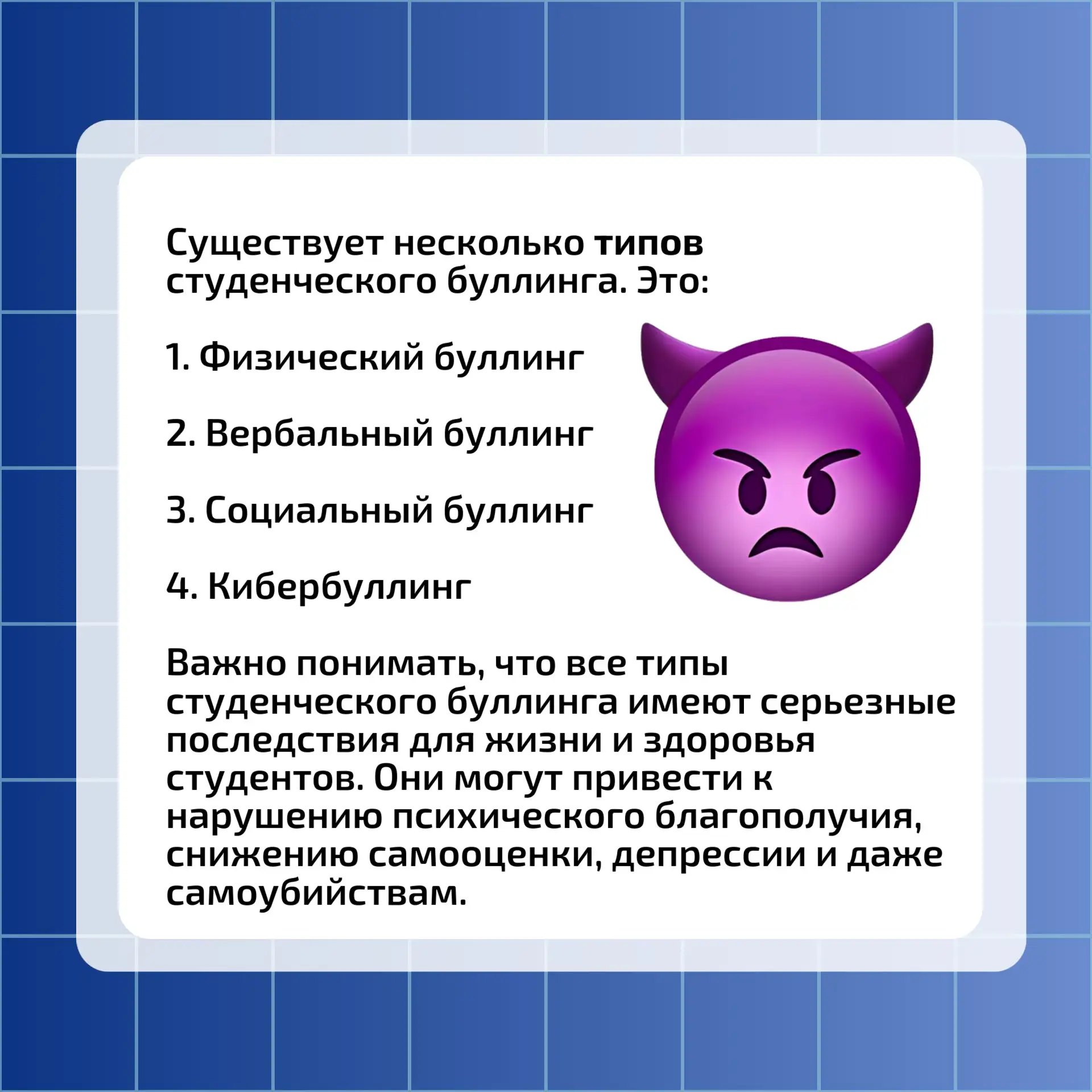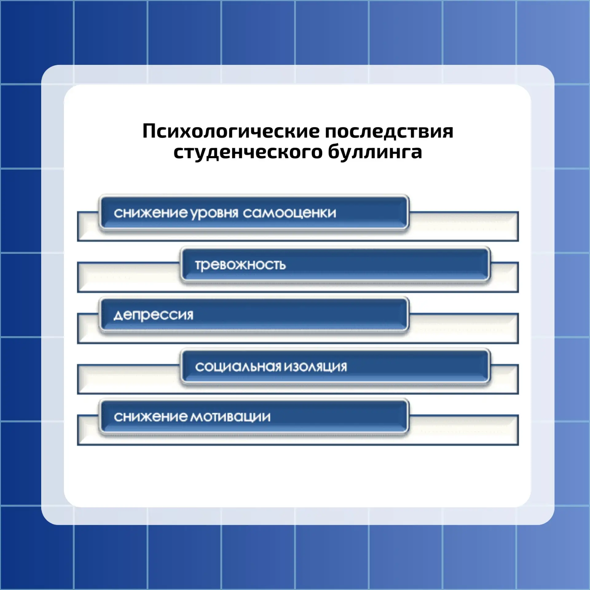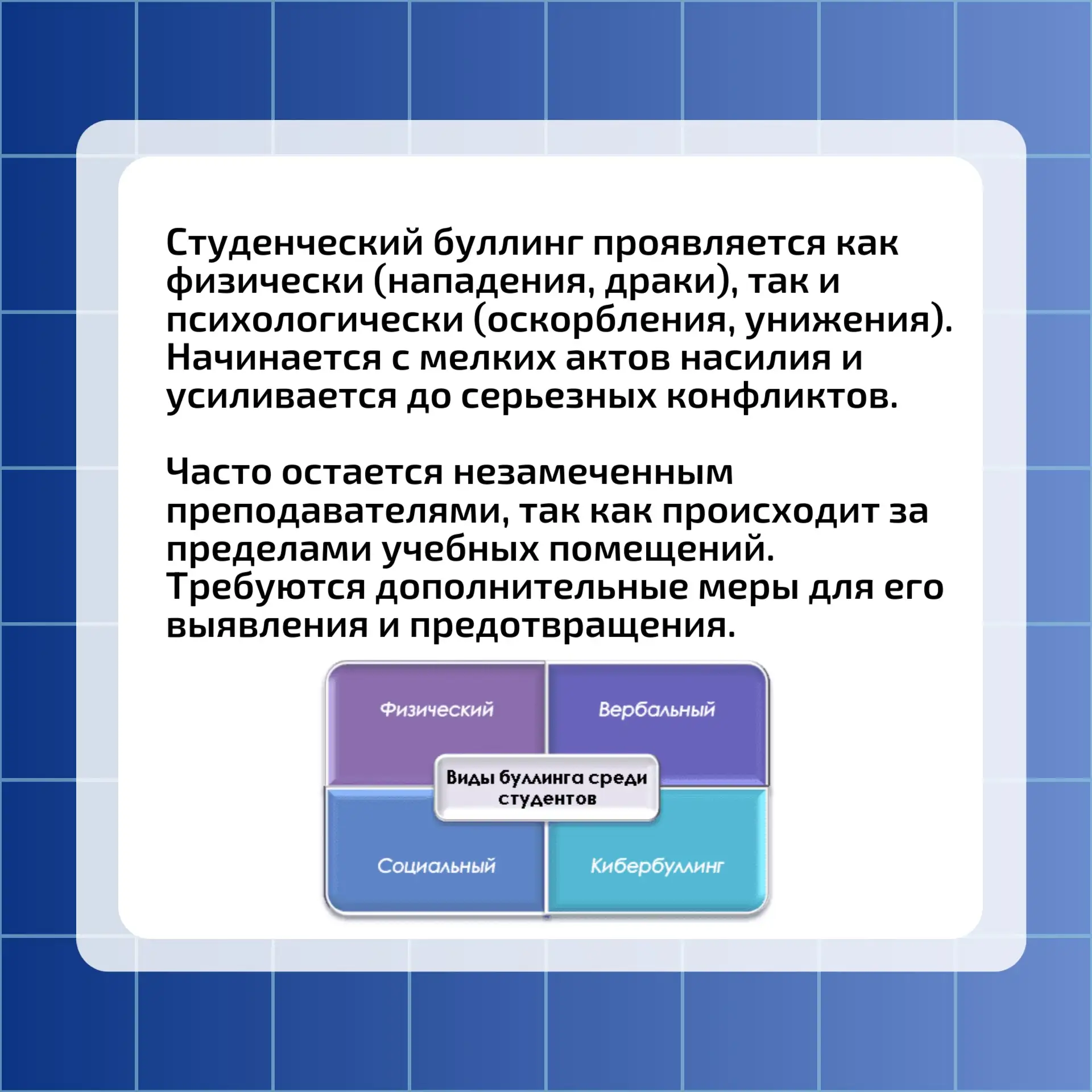 В информационных карточка мы рассмотрим особенности студенческого буллинга и его последствия для жертв.