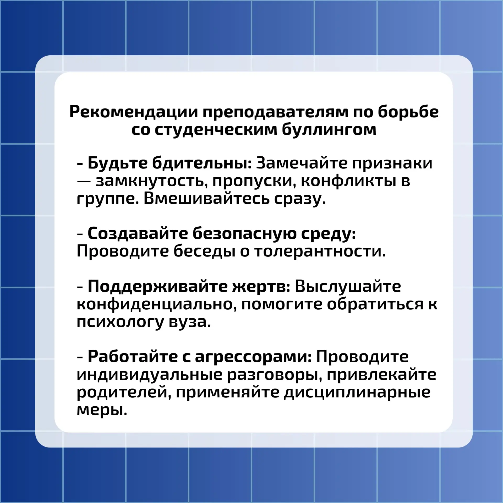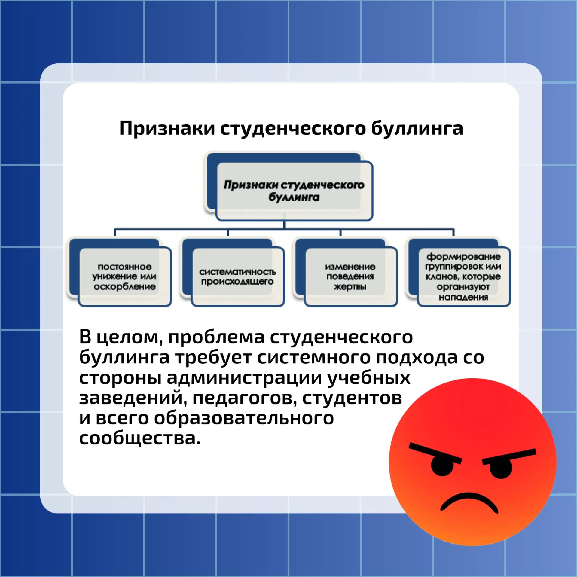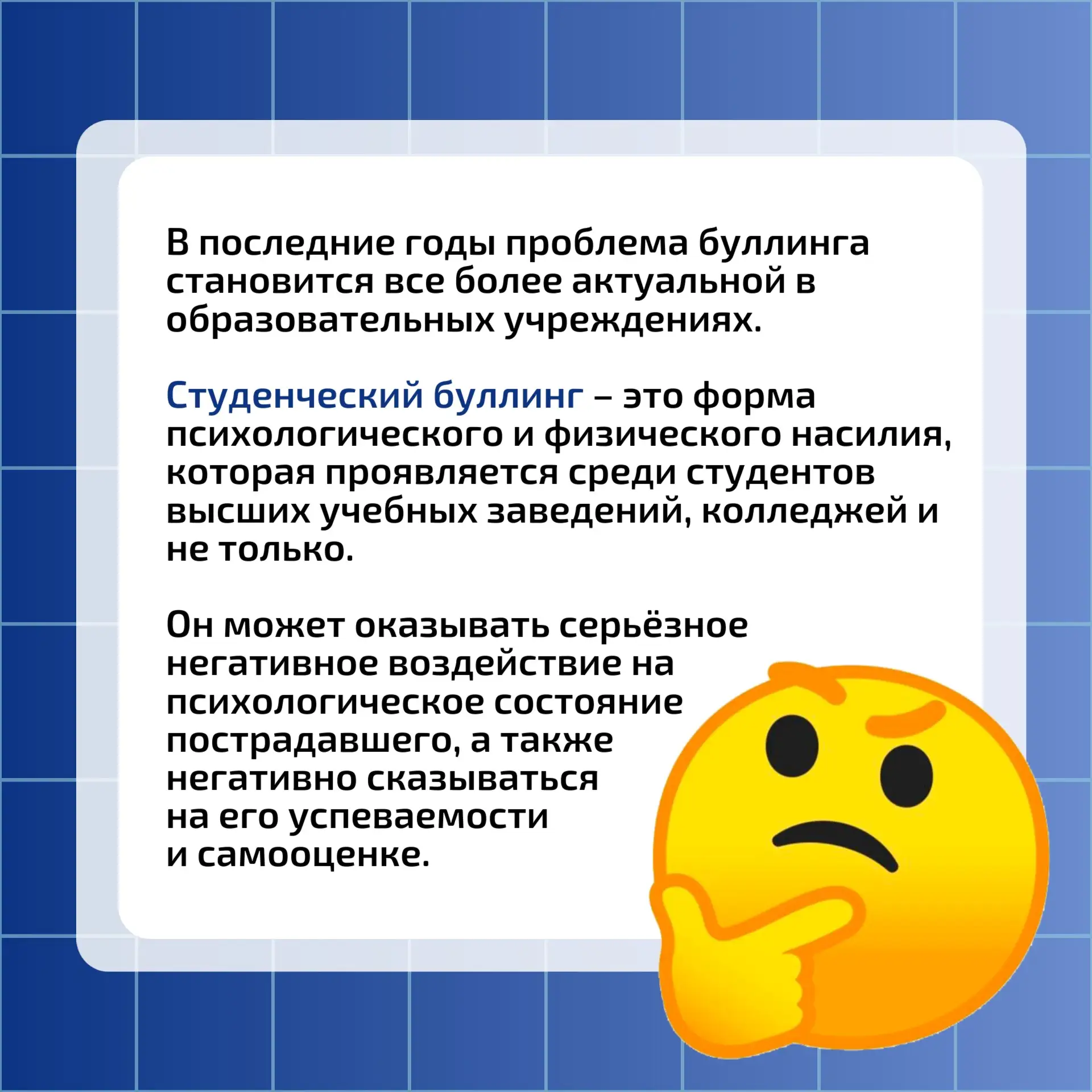 В информационных карточка мы рассмотрим особенности студенческого буллинга и его последствия для жертв.