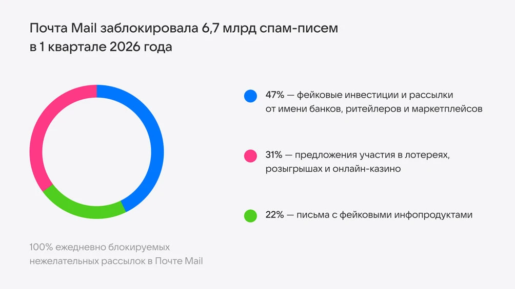 Среди актуальных сценариев — письма, замаскированные под уведомления от официальных структур, а также сообщения о доставке цветов или подарков к праздникам, фейковые инвестиционные предложения, спам, связанный с азартными играми, а также псевдообразовательные и иные "инфопродукты".