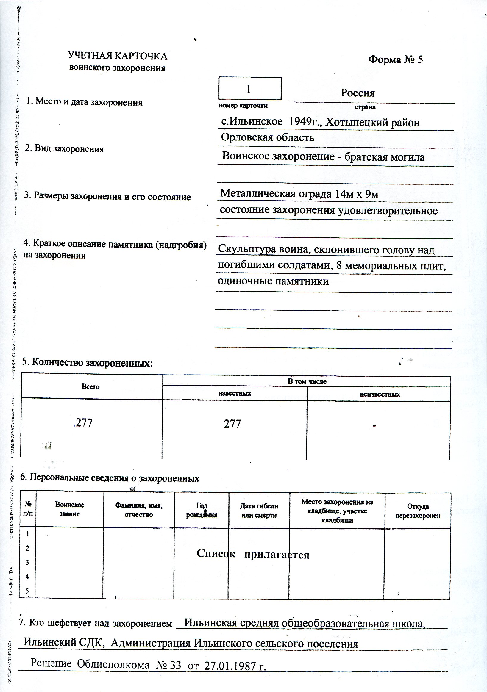 Список воинов, захороненных в братской могиле №1 с.Ильинское Хотынецкого района Орловской области
