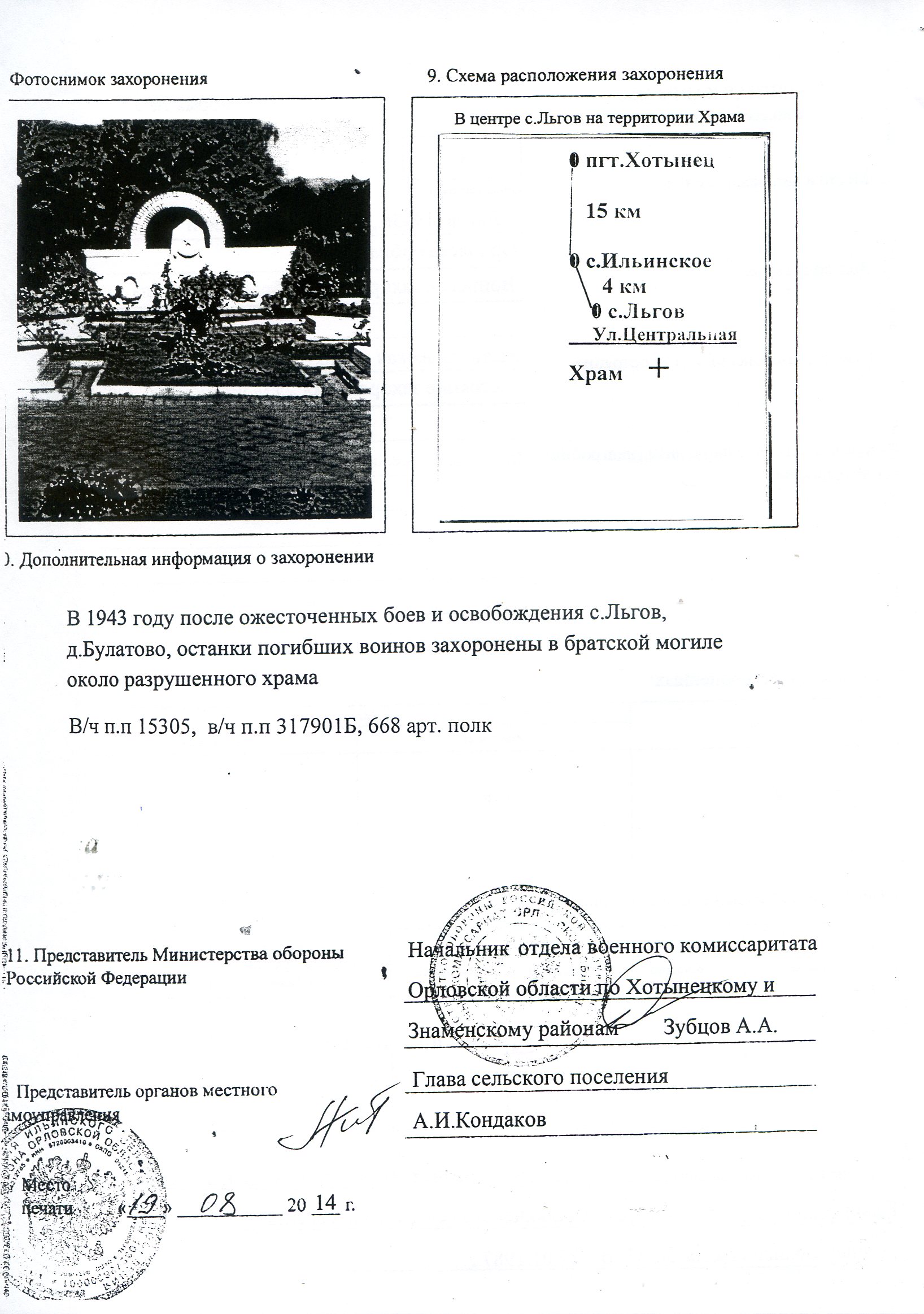 с.Ильинское – братская могила № 1 - 283 воина, погибшие за с.Ильинское, д.Волосатово; братская могила № 2- 40 воинов, погибших за д.Верховье, с.Льгов- 120 воинов, погибших за с.Льгов, д.Булатово, д.Радовище- 80 воинов, погибших за д.Радовище, с.Старое.