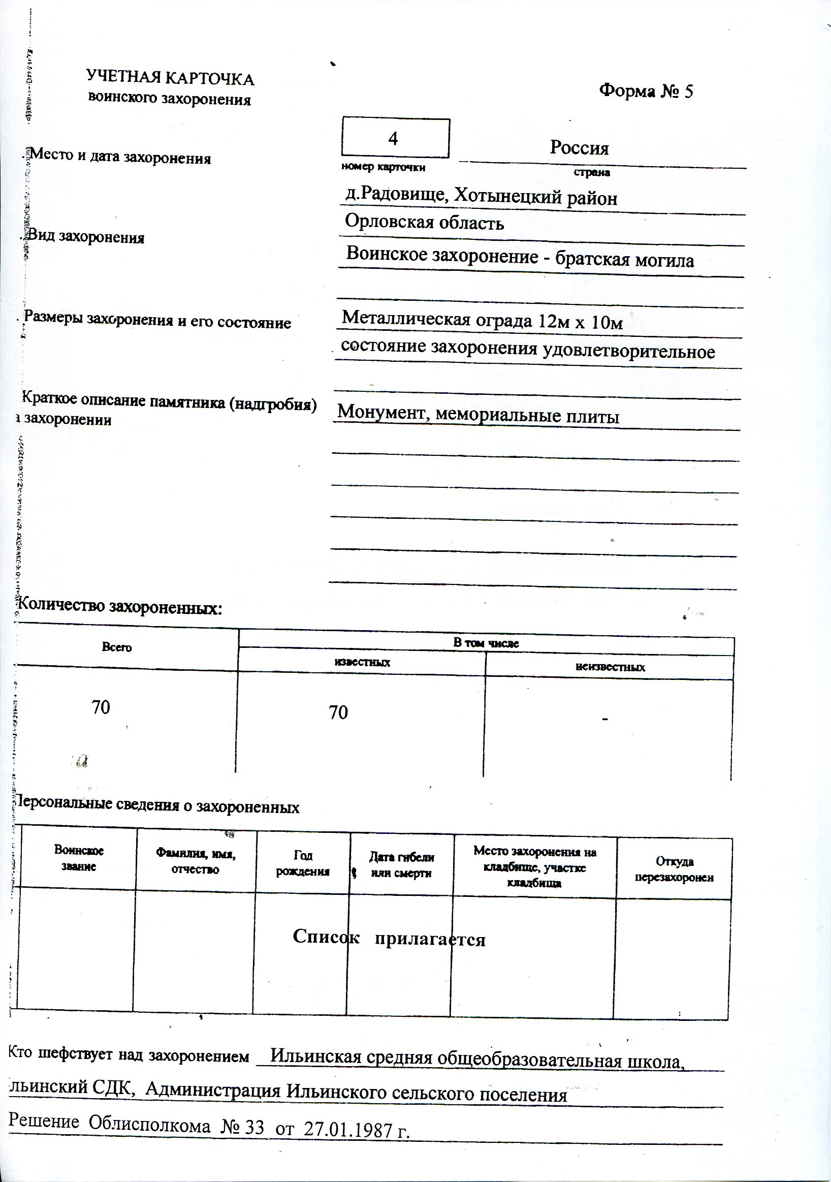 с.Ильинское – братская могила № 1 - 283 воина, погибшие за с.Ильинское, д.Волосатово; братская могила № 2- 40 воинов, погибших за д.Верховье, с.Льгов- 120 воинов, погибших за с.Льгов, д.Булатово, д.Радовище- 80 воинов, погибших за д.Радовище, с.Старое.