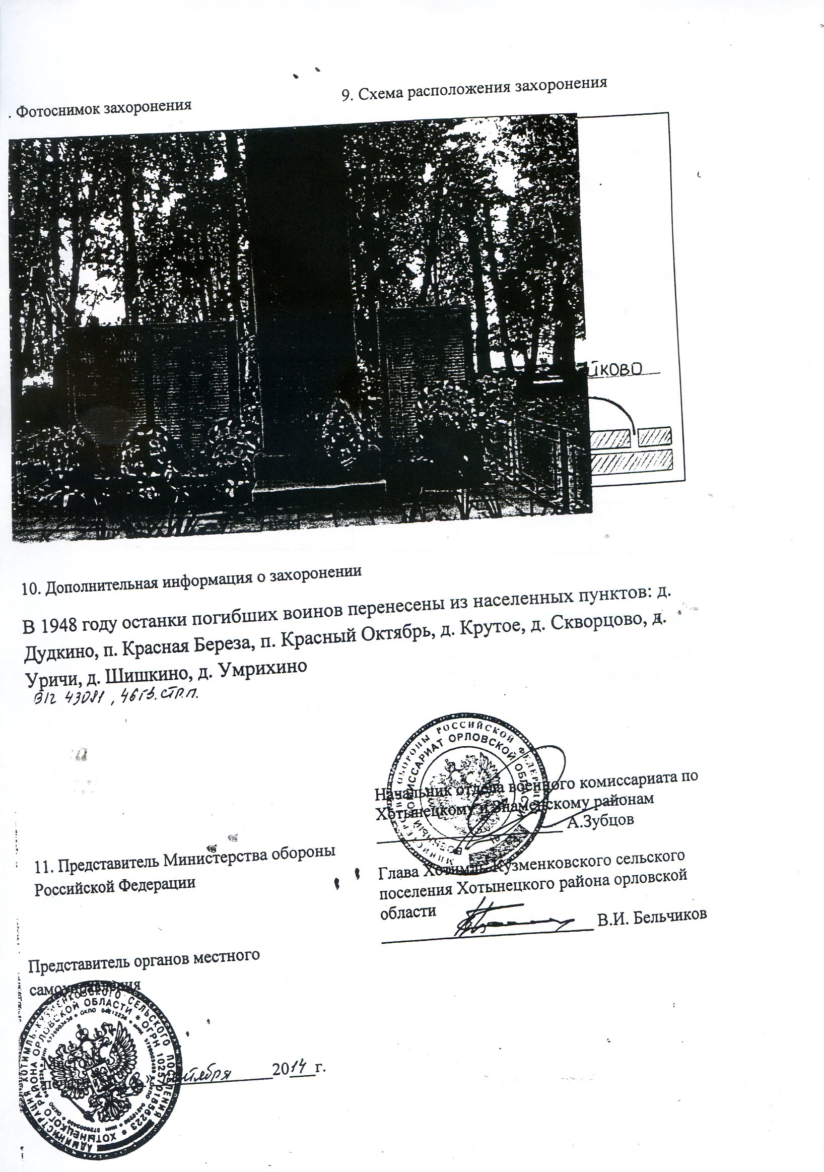 На территории Хотимль-Кузменковского сельского поселения в братских могилах в д. Скворцово и пос. Жудро покоятся останки более 400 советских воинов. Тяжелые бои на территории района проходили в июле-августе 1943 г.С 17 июля по 10 августа на территории нынешнего Орловского Полесья проходила наступательная операция "Кутузов", в которой участвовало 16 армий – 10 пехотных, 3 воздушных и 3 танковых. Войска левого крыла Западного фронта получили задачу прорвать немецкую оборону на северном фасе орловского выступа, юго-западнее Козельска. После прорыва обороны противника ударная группировка Западного фронта разделялась для наступления на двух расходящихся направлениях. Первая группа должна была принять участие в разгроме Болховской группировки противника, вторая – наступать в общем направлении на Хотынец, где был узел шоссейных дорог и станция железной дороги Орёл – Брянск. В результате советские войска должны были перехватить основную линию снабжения вермахта в районе Орла. В смертельной схватке сошлись более 500 тысяч солдат, 1000 самолетов и 3000 танков. 11-я стрелковая дивизия стремилась по кратчайшему пути выйти к железной дороге Хотынец – Карачев. С правого фланга сюда, в район Ильинского, перебрасывается 16-я гвардейская стрелковая дивизия. Она начала наступление в направлении Хотимль, Жудре, Умрихино, Строево, Скворцовский. Из архивных данных : «16 ГД была переброшена в район южнее Тросны для развития успеха 11 ГСД в направлении Хотынца».