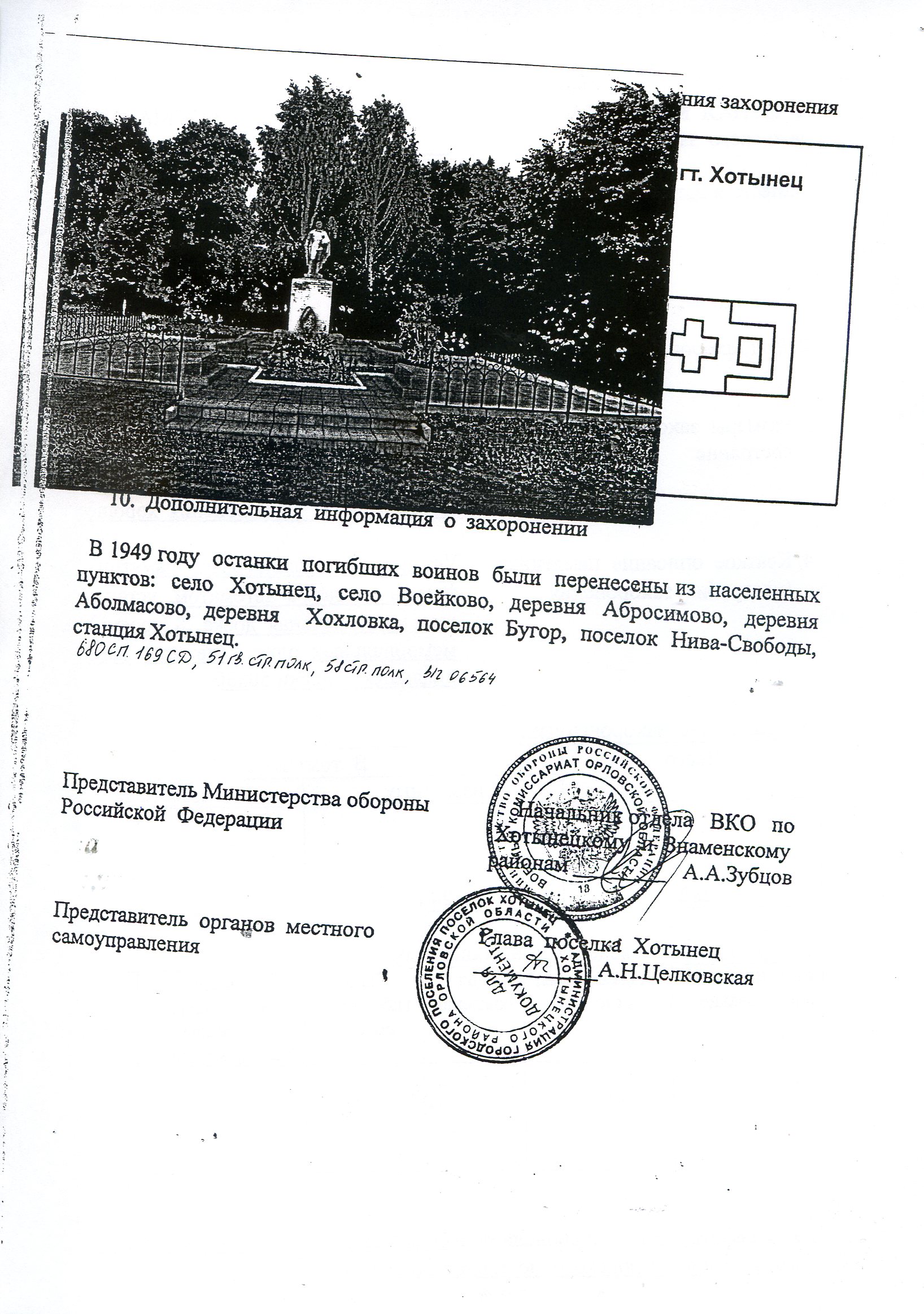 Историческая справка с описанием боёв и событий времён Великой Отечественной войны, в результате которых погибли солдаты и командиры Красной Армии, погребённые на территории пгт. Хотынец