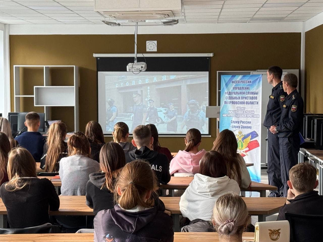 Ñîòðóäíèêè Óïðàâëåíèÿ Ôåäåðàëüíîé ñëóæáû ñóäåáíûõ ïðèñòàâîâ ïî Îðëîâñêîé îáëàñòè àêòèâíî âçàèìîäåéñòâóþò ñ ìîëîäåæüþ, ïðîâîäÿ ñïåöèàëèçèðîâàííûå ëåêöèè è ñåìèíàðû â âûñøèõ çàâåäåíèÿõ ãîðîäà. Öåëü ìåðîïðèÿòèé çàêëþ÷àåòñÿ â îçíàêîìëåíèè áóäóùèõ âûïóñêíèêîâ ñ äåÿòåëüíîñòüþ îðãàíà ïðèíóäèòåëüíîãî èñïîëíåíèÿ, ïîïóëÿðèçàöèè ïðîôåññèè ñóäåáíîãî ïðèñòàâà è ïðåäîñòàâëåíèè ïîäðîáíîé èíôîðìàöèè î ïðåèìóùåñòâàõ ñëóæáû â äàííîì âåäîìñòâå.